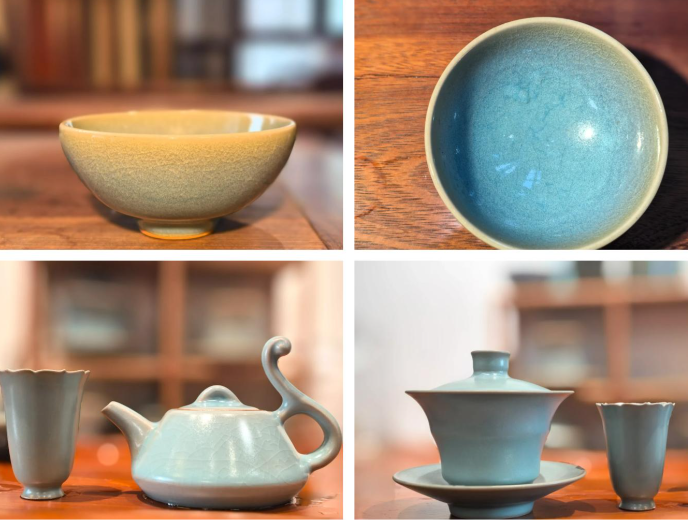传统汝瓷以礼器为主,如今衍生出大量生活化文创:天青茶杯、茶宠、香插、迷你花瓶、文房镇纸。小巧精致、手感温润,适配茶桌、书桌、案头,自带高级感。不少文创店推出汝瓷+茶叶、汝瓷+香道的礼盒套装,成为高端伴手礼首选。